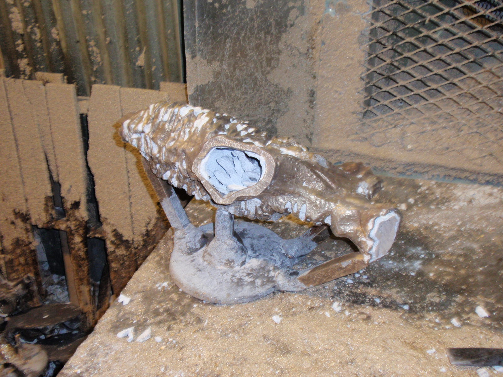 The cooler the bronze is the easier the ceramic is to get off. This process of breaking the mold is referred to as “shake out.” The shell mold is a one-time use mold so every bronze sculpture gets its own ceramic mold even though all one-time use molds come from the same rubber mold of the original. With all the ceramic removed, the art can be taken in to the cut off area where we use a plasma torch to cut off all gates and plugs. The art can be sandblasted and all parts and plugs found will be weighted and documented. The bronze castings will then leave and go back to the artist or a finish shop to be welded and metal chased.