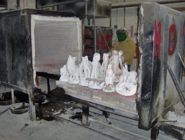 Once the de-waxed shells come out of the kiln they will be left to cool. Then our staff will be able to fill the shells with water to check for stress cracks and rinse any carbon out. The stress cracks come from the wax expanding before the shell is at its strongest point. Then the shell cracks will be filled, applying a brick mortar for strength. This is the safety net if we were to break the shell or have bronze leak out. We would have to start all over again with the mold and wax pouring, so this is the last chance to fix possible problems to obtain a perfect casting.